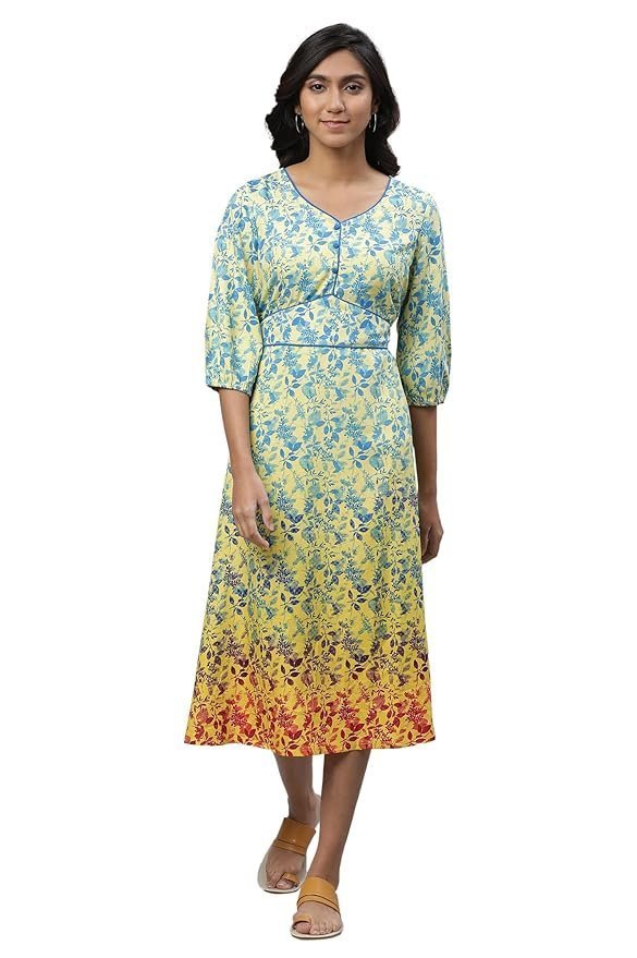 - This yellow A-line midi dress from Aurelia is a perfect casual wear option. Made from 100% polyester, it features a V-neckline and three-quarter sleeves. The leaf print design adds a refreshing touch to this western-inspired piece.